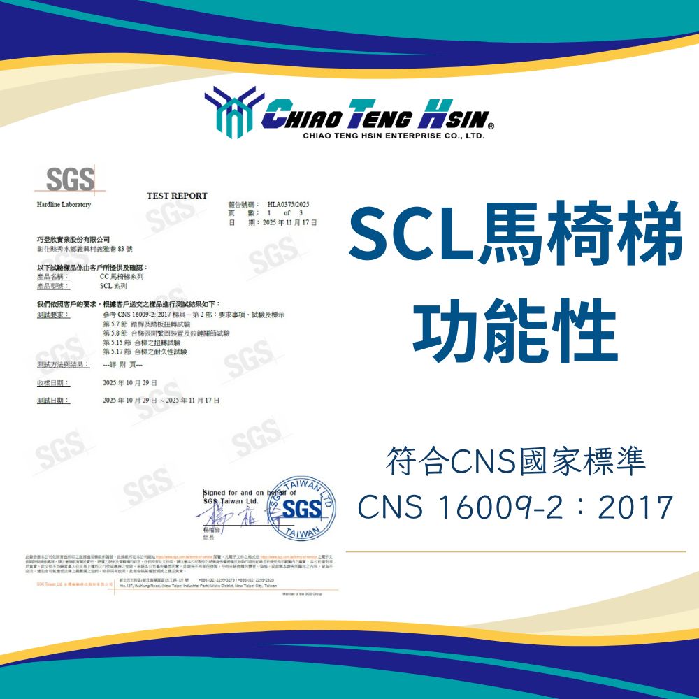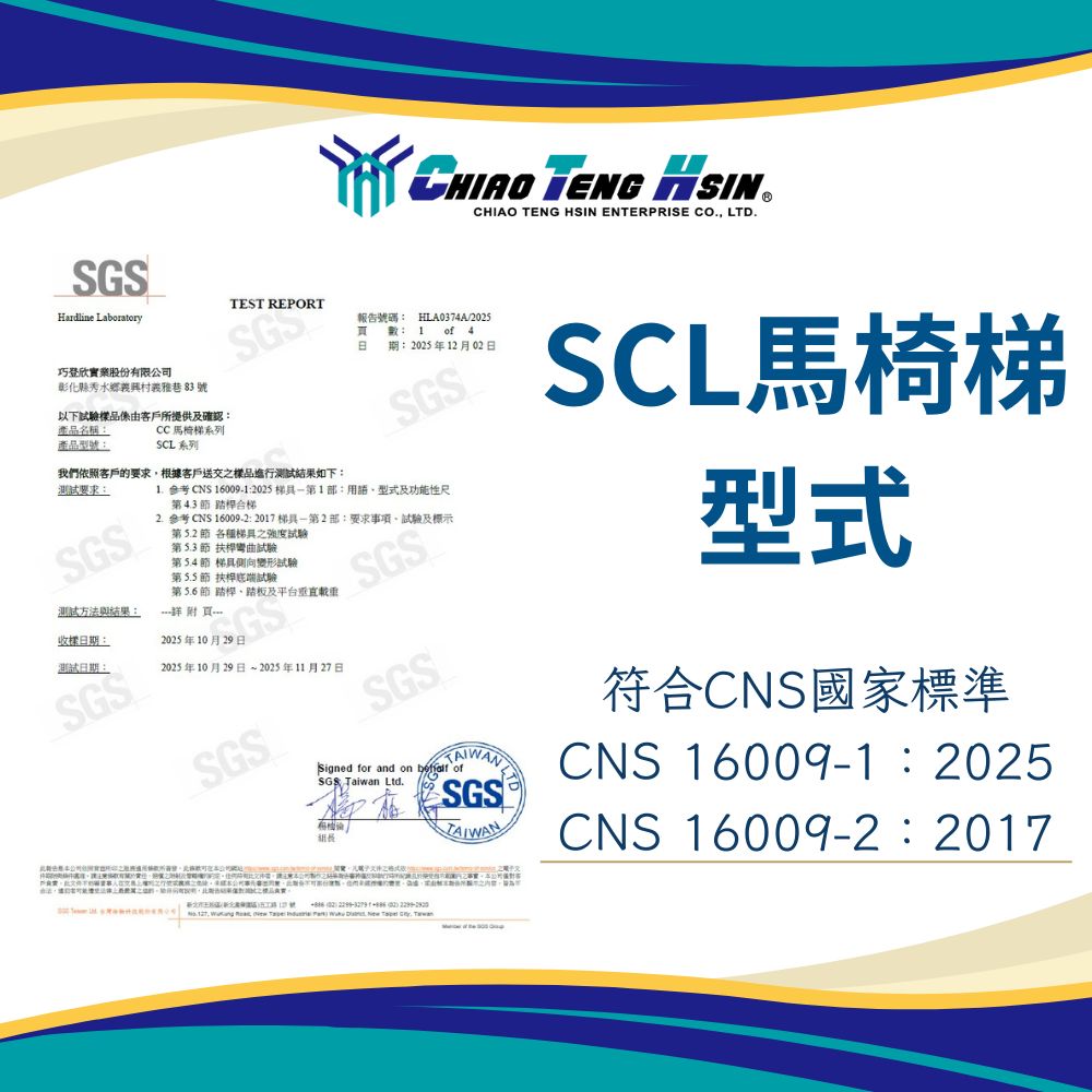 檢測結果顯示,ACL帆蓋梯(焊接馬椅梯)、SCL鎖螺絲馬椅梯均符合CNS16009-1:2025、CNS16009-2:2017國家安全標準。這不僅代表巧登欣的產品在「穩固性」、「耐用性」與「整體安全性」上獲得專業認可,也再次證明我們持續提供高品質梯具的能力與決心。我們希望所有使用者在日常生活、居家 DIY、工地作業或其他工作場景中,都能安心依賴由巧登欣所製造的梯具。